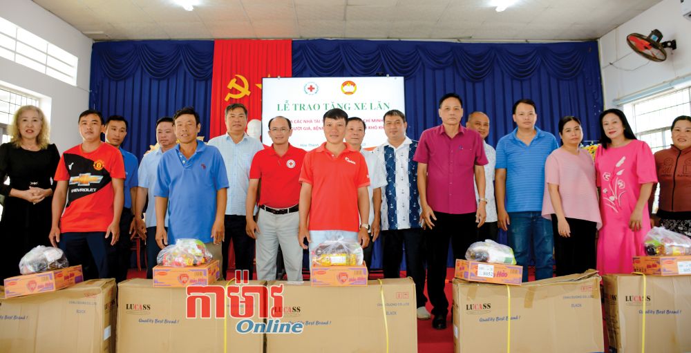 លោក Lê Quốc Văn ប្រធានសមាគមកាកបាទក្រហមខេត្ត (ទីប្រាំមួយរាប់ពីស្តាំ) រួមជាមួយអ្នកឧបត្ថម្ភ តំណាងគណៈកម្មាធិការរណសិរ្សមាតុភូមិ Việt Nam សង្កាត់ Hoà Thành បានប្រគល់រទេះរុញមួយគ្រឿងដល់ជនពិការ។