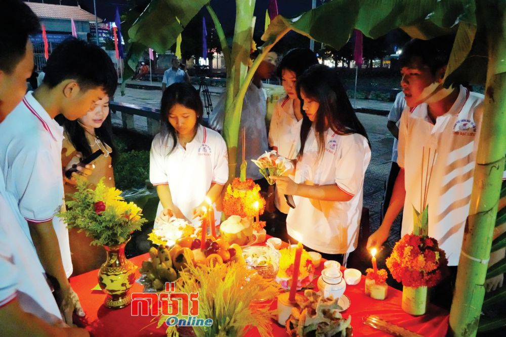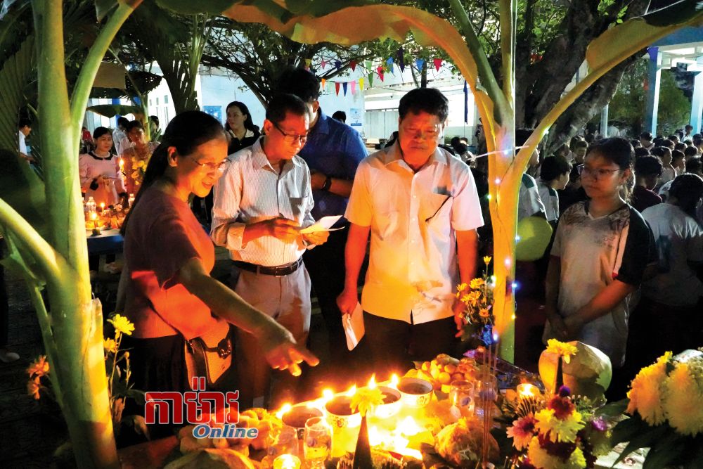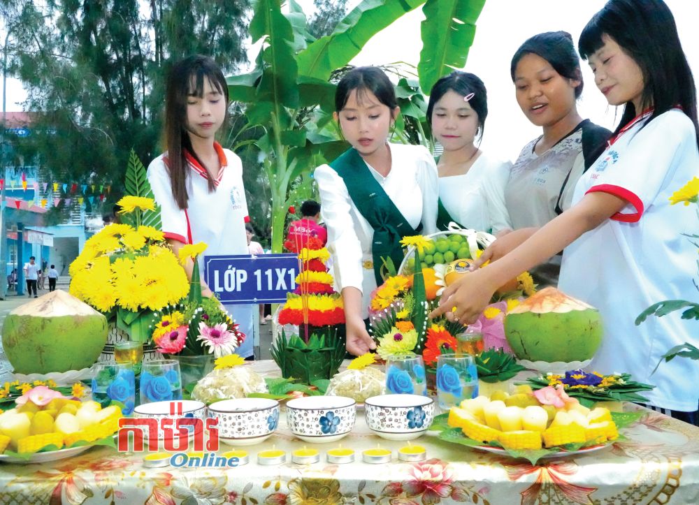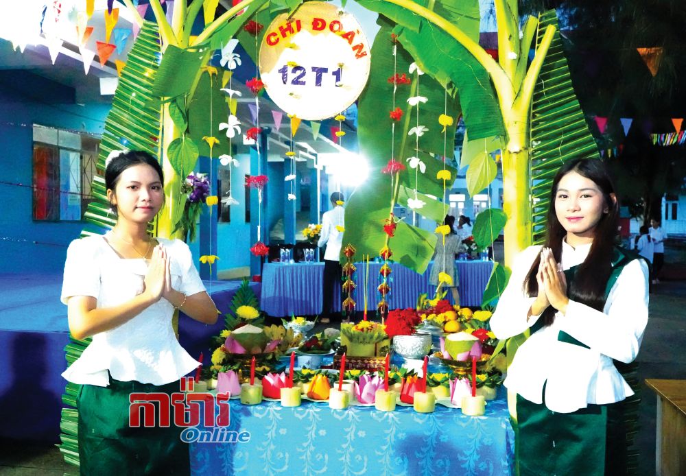ប្អូនៗសិស្សថ្នាក់ទី ១១X១ នៃសាលាជនជាតិអន្តេវាសិក រៀបតុបតែងគ្រឿងសក្ការៈសម្រាប់ថ្វាយព្រះចន្ទ។