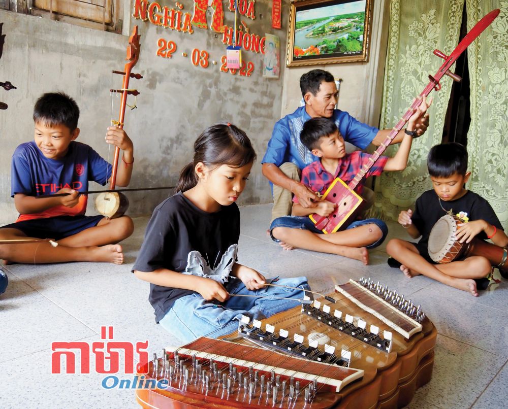 បង្រៀនភ្លេងប្រពៃណីស្គរធំរបស់ជនរួមជាតិ Khmer ដល់ក្មេងៗជំនាន់ក្រោយ។ (រូបថតនៅឃុំ Hồ Thị Kỷ)