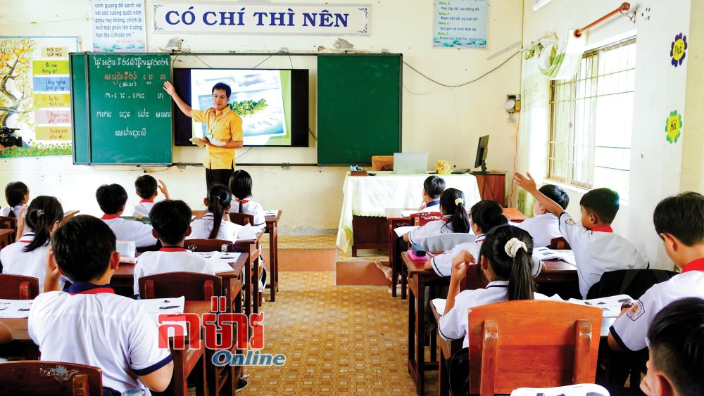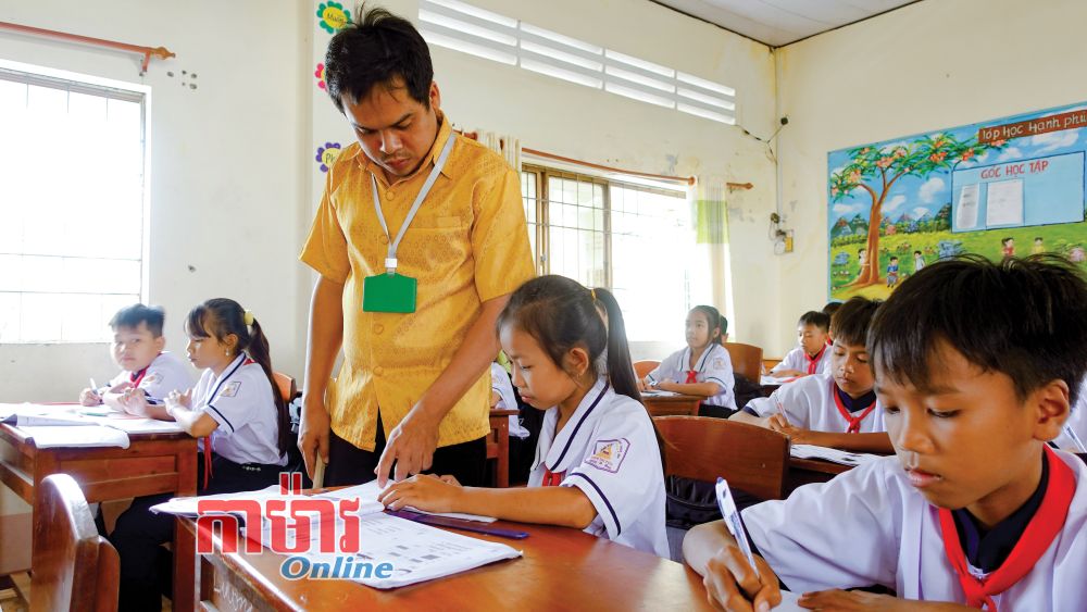 លោកគ្រូ Tăng Quốc Đạt ណែនាំសិស្សអាននិងសរសេរអក្សរ Khmer។