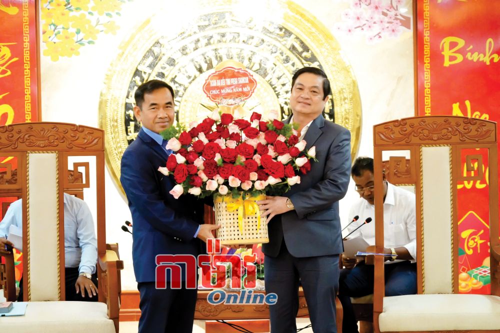 លោក Em Pheap អភិបាលរងខេត្ត Prah Sihanouk (ឆ្វេង) ជូនបាច់ផ្កាប្រសិទ្ធពរឆ្នាំថ្មីដល់ប្រធានគណៈកម្មាធិការប្រជាជនខេត្ត Cà Mau លោក Huỳnh Chí Nguyện សម្តែងពីមិត្តភាព និងកិច្ចសហប្រតិបត្តិការរវាងខេត្តទាំងពីរ។