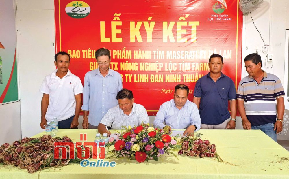 សហករណ៍កសិកម្ម ឡុកទីម Farm និងក្រុមហ៊ុន Linh Đan Ninh Thuận ចុះហត្ថលេខាលើកិច្ចសន្យាផ្គត់ផ្គង់ពូជ និងធានាប្រមូលទិញផលិតផលខ្ទឹមក្រហម។