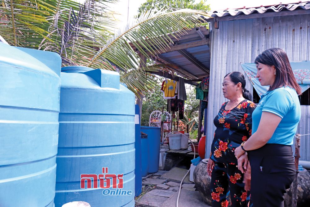 អ្នកមីង Thạch Thị Rớ នៅភូមិ Đồng Tâm A ឃុំ Đầm Dơi (ឆ្វេង) ស្តុកទឹកភ្លៀងក្នុងធុងសម្រាប់ប្រើប្រាស់ក្នុងរដូវប្រាំង។