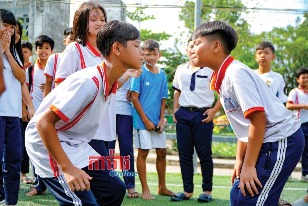 ប្អូនៗចូលរួមលេងល្បែងហុចបន្តផ្លែក្រូចដោយស្លាបព្រា។