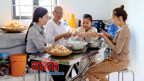 អ្នកមីង Thạch Thị Niêm នៅអនុសង្កាត់ Biển Đông B សង្កាត់ HiệpThành កំពុងបង្ហាត់បង្ហាញកូនចៅពីរបៀបធ្វើនំខ្ញី។