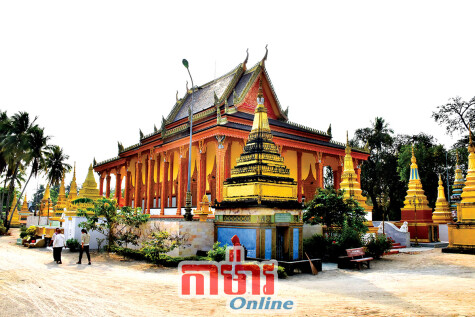 ព្រះវិហារវត្តព្រៃវែង អមជាមួយព័ត៌លឿងដ៏ត្រចះត្រចង់ និងក្បាច់ចម្លាក់ពោរពេញដយលក្ខណៈពុទ្ធសាសនាខ្មែរ។