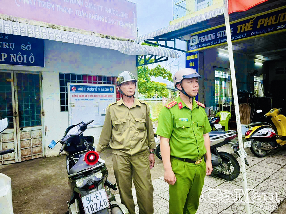 Lực lượng Công an xã Phước Long cùng Tổ ANTT cơ sở phát loa di động về chương trình “An ninh truyền thanh số” tại các khu dân cư trên địa bàn.