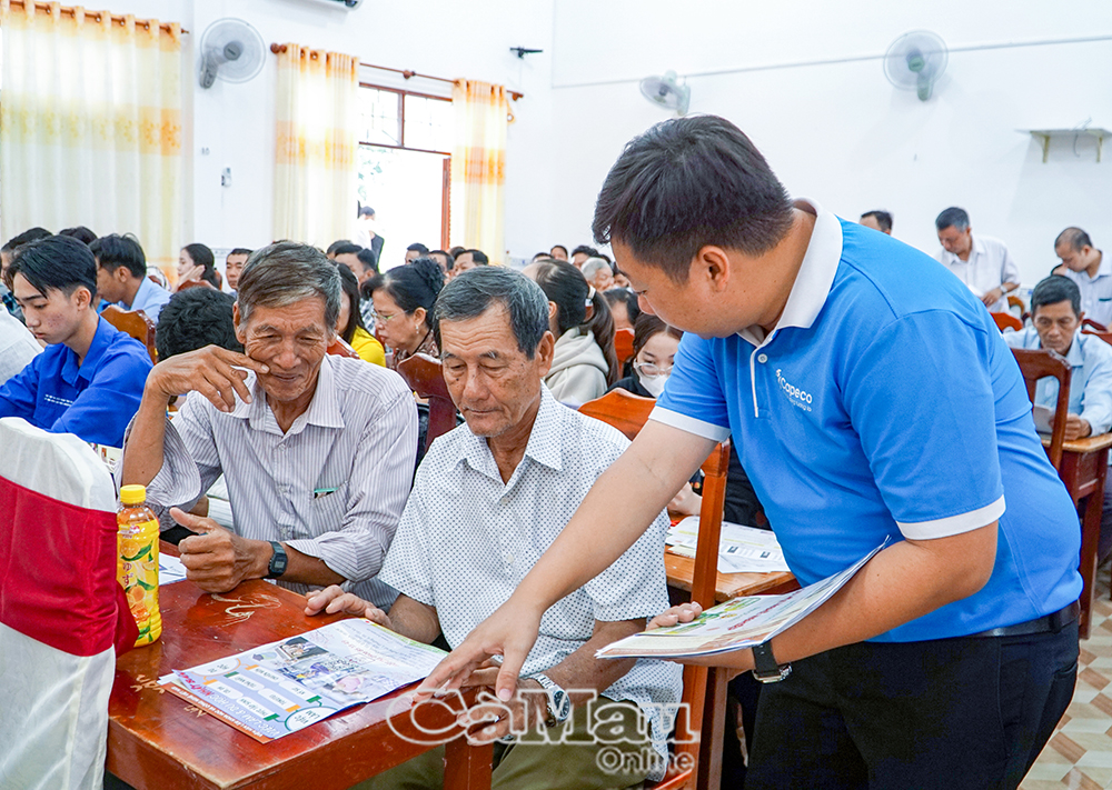 Các tư vấn viên của Trung tâm Dịch vụ việc làm tỉnh Cà Mau thông tin về cơ hội nghề nghiệp và việc làm với bà con xã Tân Hưng tại phiên giao dịch việc làm.