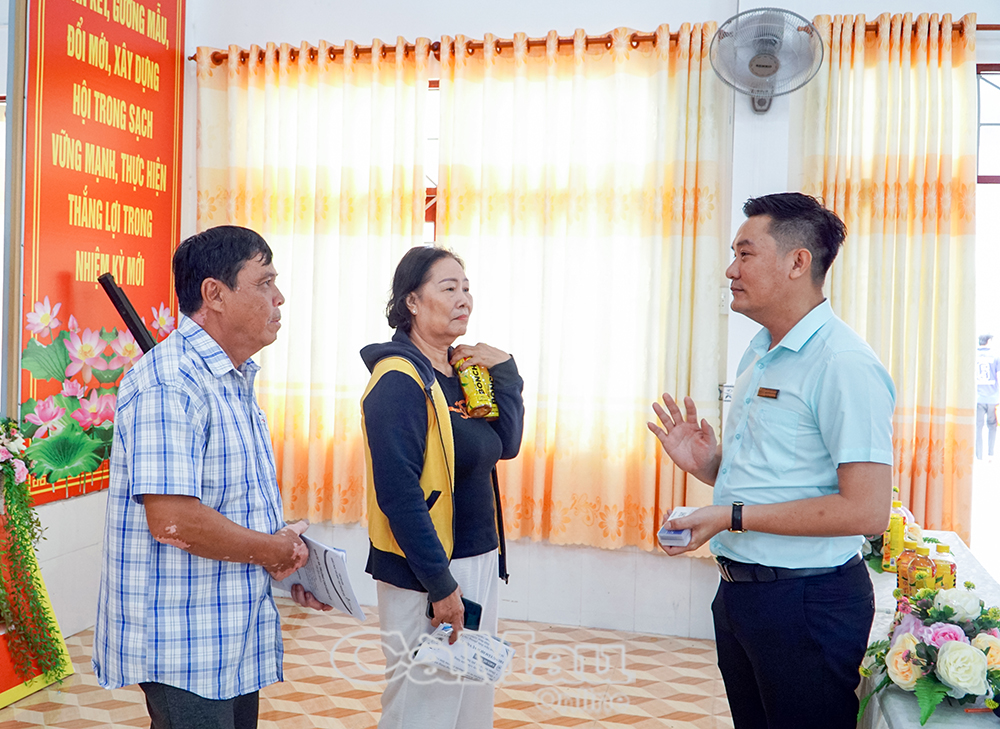 Đồng hành cùng các phiên giao dịch việc làm là các doanh nghiệp, cơ sở đào tạo được cấp phép phối hợp thực hiện việc đưa người lao động sang nước ngoài làm việc theo hợp đồng. (Ảnh: Ông Nguyễn Chí Hải, Phó Tổng Giám đốc Công ty Cổ phần Giáo dục Quốc tế Capeco (Tập đoàn ICOGroup) chi nhánh Cà Mau, tư vấn thông tin cho bà con xã Tân Hưng về xuất khẩu lao động).