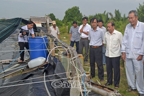 | Đoàn cán bộ huyện Đầm Dơi kiểm tra, giám sát mô hình nuôi tôm siêu thâm canh. |
