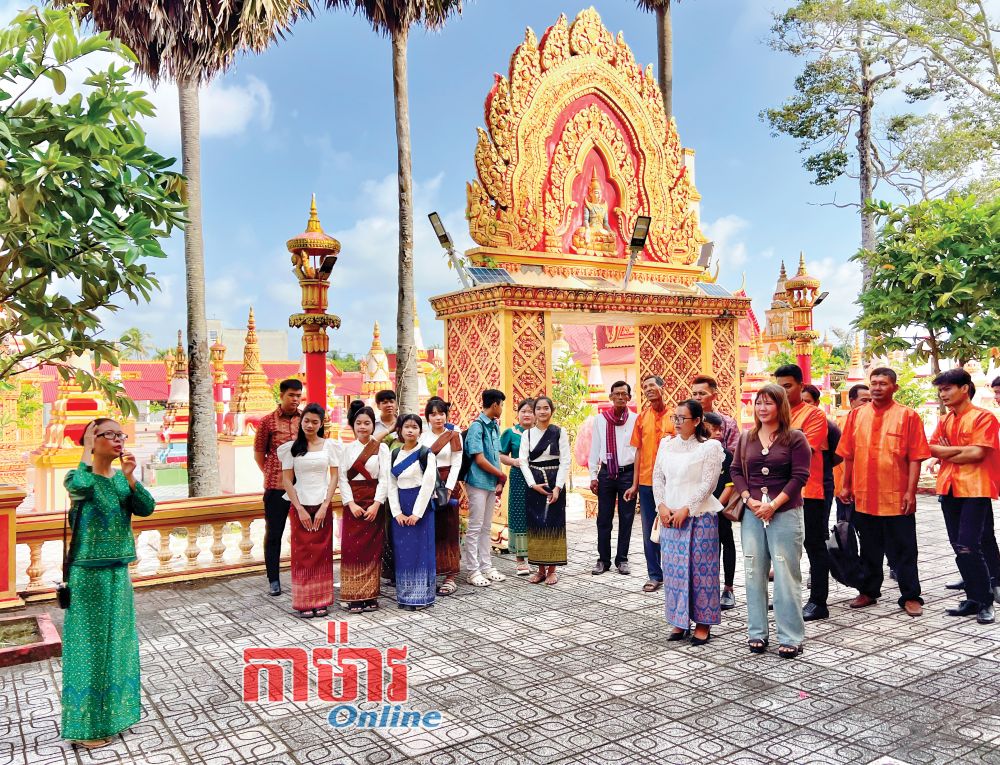 សិក្ខាកាមវគ្គបំប៉នចំណេះដឹងវប្បធម៌ទេសចរណ៍ និងសិល្បៈ Khmer អនុវត្តជាក់ស្តែងនូវបំណិនឧទ្ទេសនាមនៅវត្តគម្ភីរសាគរ ព្រែកជ្រៅ (Xiêm Cán) នៅសង្កាត់ Hiệp Thành។
