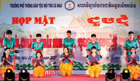 របាំគោះត្រឡោក សព្វថ្ងៃកំពុងត្រូវបានប្អូនៗសិស្សសាលាអន្តេវាសិក Cà Mau បន្តអភិរក្សយ៉ាងសកម្ម។