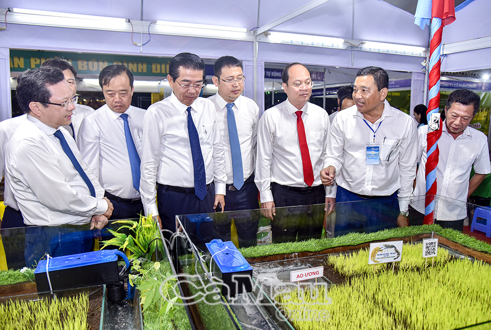 Bí thư Tỉnh uỷ Nguyễn Hồ Hải (thứ 3 từ phải sang) cùng các đồng chí lãnh đạo, nguyên lãnh đạo các ban, ngành Trung ương và lãnh đạo tỉnh Cà Mau, tham quan gian hàng trưng bày mô hình lúa thơm - tôm sạch của Sở NN&MT Cà Mau.