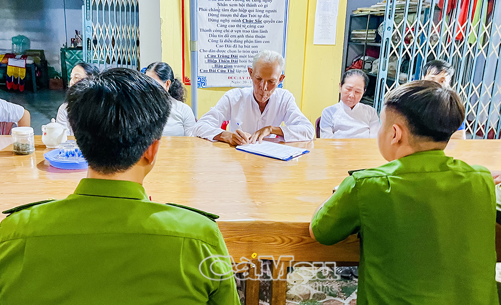 Trung tá Nguyễn Văn Lắm, Trưởng Công an xã Phong Hiệp (bìa phải) cùng lực lượng đến gặp gỡ, trao đổi với chức sắc, chức việc của Thánh Thất Thiện Tâm Đàn.