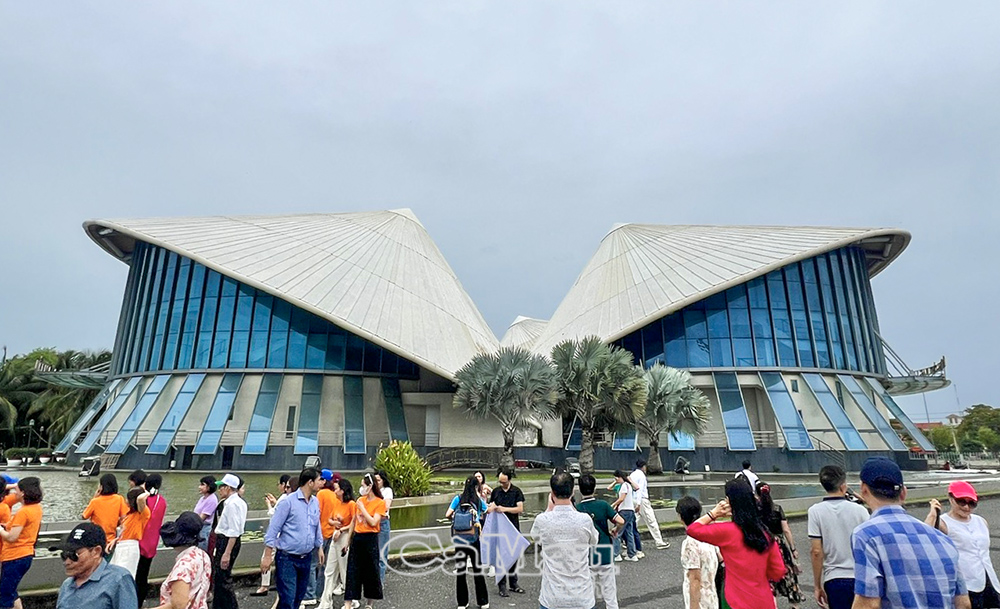 Du khách ngoài tỉnh tham quan Nhà hát 3 nón lá tại phường Bạc Liêu.