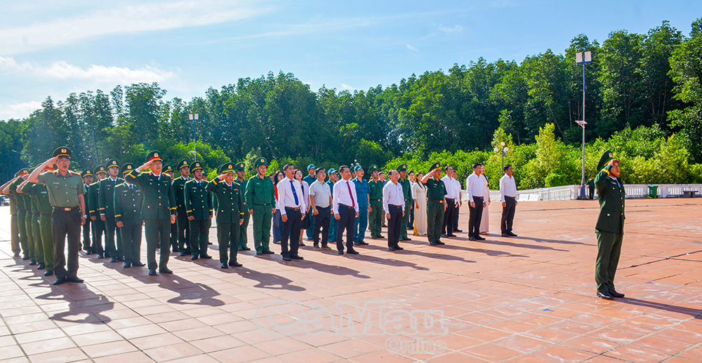 Các đại biểu và chiến sĩ Công an, Đồn Biên phòng Đất Mũi nghiêm trang làm lễ chào cờ tại Cột cờ Hà Nội, Khu Du lịch Mũi Cà Mau.