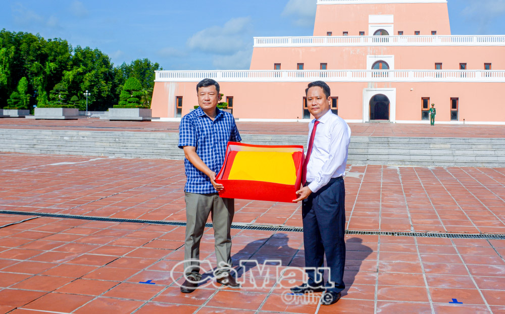 Nhà báo Trương Thành Trung, Tổng Biên tập Báo Đại Đoàn Kết, nhận cờ Tổ quốc của Vườn Quốc gia Mũi Cà Mau trao tặng.