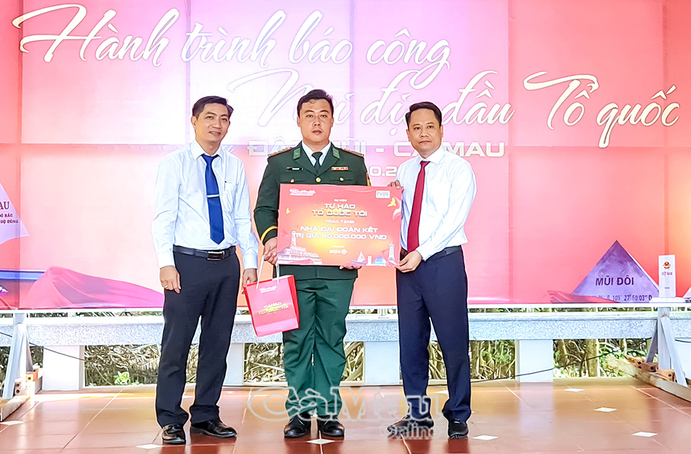 Đại diện Báo Đại Đoàn Kết và Uỷ ban MTTQ Việt Nam tỉnh trao tặng bảng tượng trưng nhà Đại đoàn kết cho cán bộ có hoàn cảnh khó khăn của Đồn Biên phòng Đất Mũi.