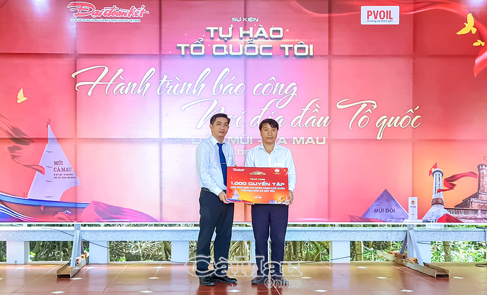 Đồng chí Bùi Minh Hải, Phó Chủ tịch Uỷ ban MTTQ Việt Nam tỉnh trao tặng 1.000 quyển tập cho các em học sinh có hoàn cảnh khó khăn trên địa bàn xã Đất Mũi.