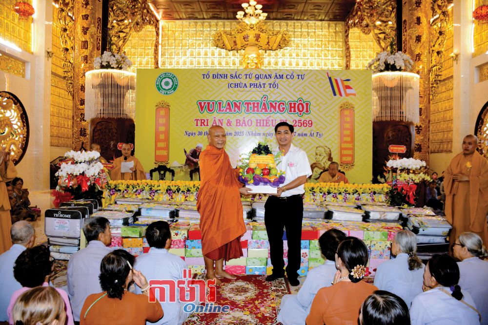 នាឱកាសនេះដែរ តំណាងគណៈកម្មាធិការរណសិរ្សមាតុភូមិ Việt Nam ខេត្តរួមជាមួយបណ្តាស្ថាប័ន អង្គភាពមានជាច្រើនអំណោយសម្រាប់ក្នុងការបុណ្យវុឡាងផងដែរ។ ក្នុងរូបថត៖ លោក Bùi Minh Hải អនុប្រធានគណៈកម្មាធិការរណសិរ្សមាតុភូមិ Việt Nam ខេត្តប្រគេនអំណោយព្រះសង្ឃ)។