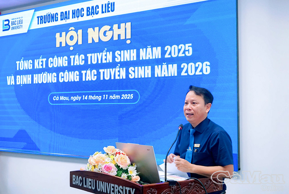 TS.Tiền Hải Lý, Phó Hiệu trưởng Trường Đại học Bạc Liêu, phát biểu khai mạc Hội nghị Tổng kết công tác tuyển sinh năm 2025 và triển khai định hướng tuyển sinh năm 2026. (Ảnh: Website Hội đồng Giáo sư Nhà nước và các trường)