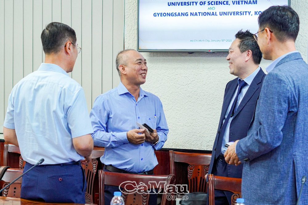 PGS.TS Ngô Đại Nghiệp, Trưởng phòng Quan hệ Đối ngoại của Trường Đại học Khoa học Tự nhiên, Đại học Quốc gia TP Hồ Chí Minh (thứ hai từ trái sang) trao đổi Biên bản ghi nhớ với Trường Đại học Quốc gia Gyeongsang (Hàn Quốc) vào ngày 10/1/2025 tại cơ sở Nguyễn Văn Cừ của Trường Đại học Khoa học Tự nhiên. (Ảnh: Website Hội đồng Giáo sư Nhà nước và các trường)