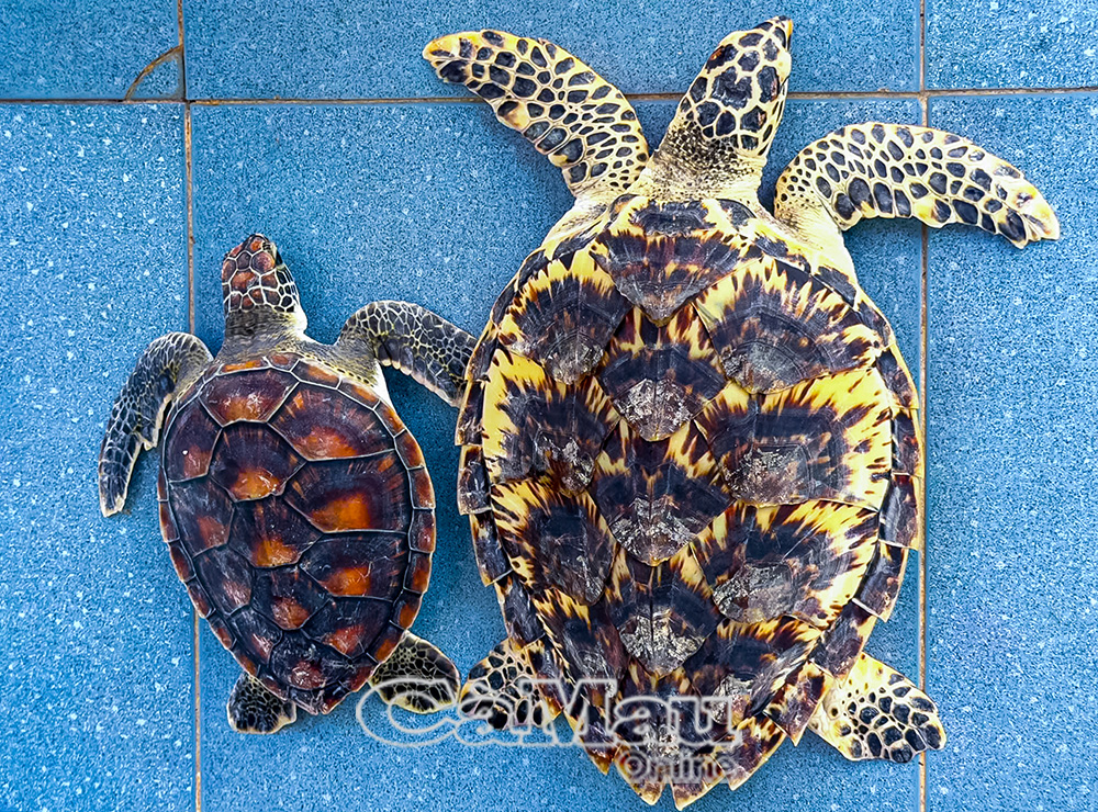 Hai cá thể đồi mồi (bên phải) và vích - loài rùa biển quý hiếm, được phát hiện và cứu hộ an toàn.