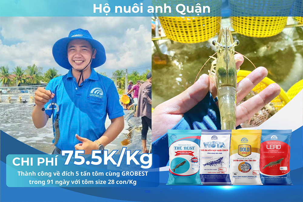 Trong suốt nhiều năm qua, The Best đã đồng hành cùng người nuôi tại các vùng trọng điểm như Cà Mau, Sóc Trăng, Bạc Liêu. Hiệu quả ấy được chứng minh rõ ràng qua mô hình nuôi tôm của anh Quận khi kết hợp bộ sản phẩm của Grobest gồm Gold Shield, Vista, Lead và The Best. Chỉ sau 91 ngày, tôm đạt size lớn 28 con/kg, sản lượng 5 tấn với chi phí sản xuất chỉ 75.500 đồng/kg.