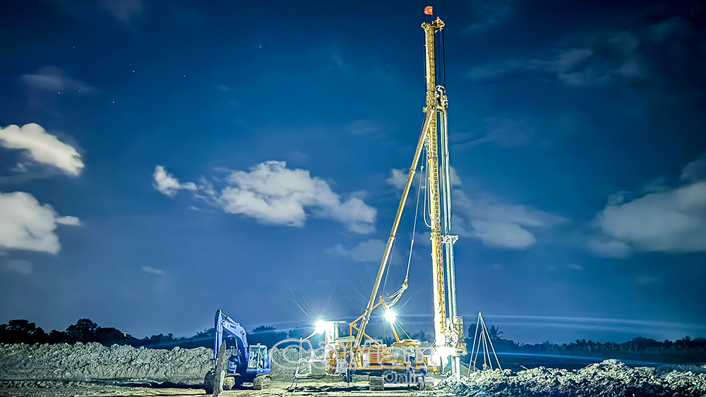 Công trường Cảng hàng không Cà Mau sáng rực ánh đèn khi các lực lượng thi công xuyên đêm, bảo đảm tiến độ hoàn thành theo kế hoạch.