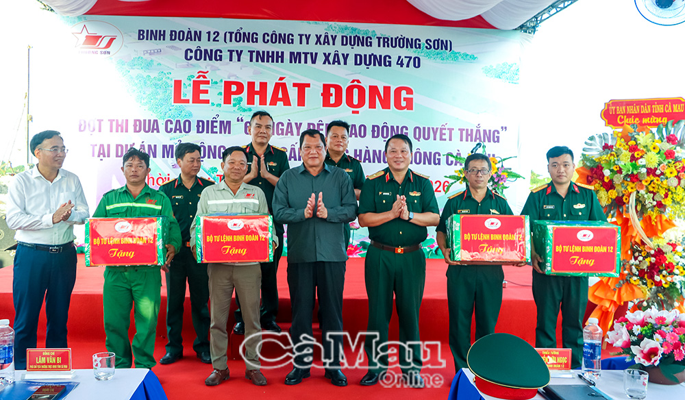 Thiếu tướng Nguyễn Hữu Ngọc, Tư lệnh Binh đoàn 12 cùng Phó Chủ tịch Thường trực UBND tỉnh Cà Mau Lâm Văn Bi và Giám đốc Ban Quản lý dự án ACV Võ Viết Tâm tặng quà, động viên người lao động ra quân trong đợt thi đua cao điểm “60 ngày đêm lao động Quyết thắng”.