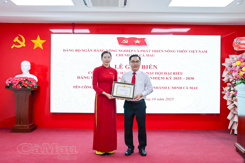 Ông Đỗ Thanh Tịnh, Giám đốc Agribank Chi nhánh tỉnh Cà Mau, trao Giấy chứng nhận công trình tiêu biểu cho bà Nguyễn Thị Kiều Tuyên, Giám đốc Agribank Chi nhánh U Minh.