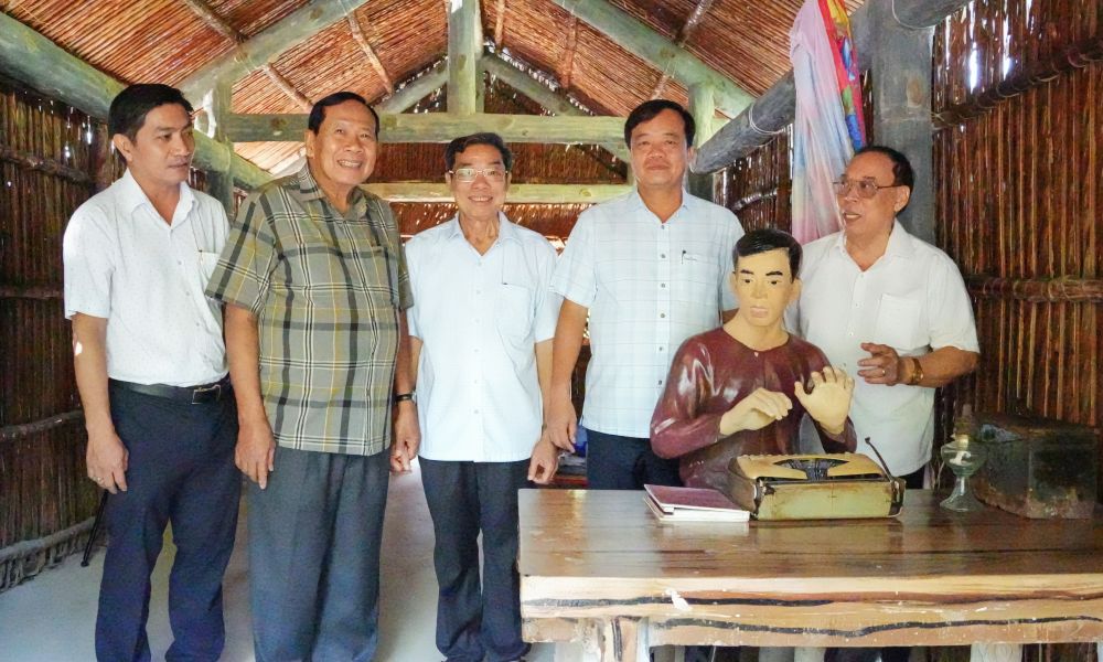 Đồng chí Huỳnh Quốc Việt, Phó Bí thư Thường trực Tỉnh uỷ (thứ 2 từ phải sang); đồng chí Phạm Thạnh Trị, nguyên Chủ tịch UBND tỉnh (bìa phải); đồng chí Trịnh Minh Thành, nguyên Chủ tịch Uỷ ban MTTQ Việt Nam tỉnh Cà Mau (thứ 2 từ trái sang) và các thành viên trong đoàn tham quan Nhà văn thư đánh máy có không gian trưng bày tái hiện qua lời kể của chính nhân vật từng sống và làm việc tại đây là đồng chí Phạm Thạnh Trị.