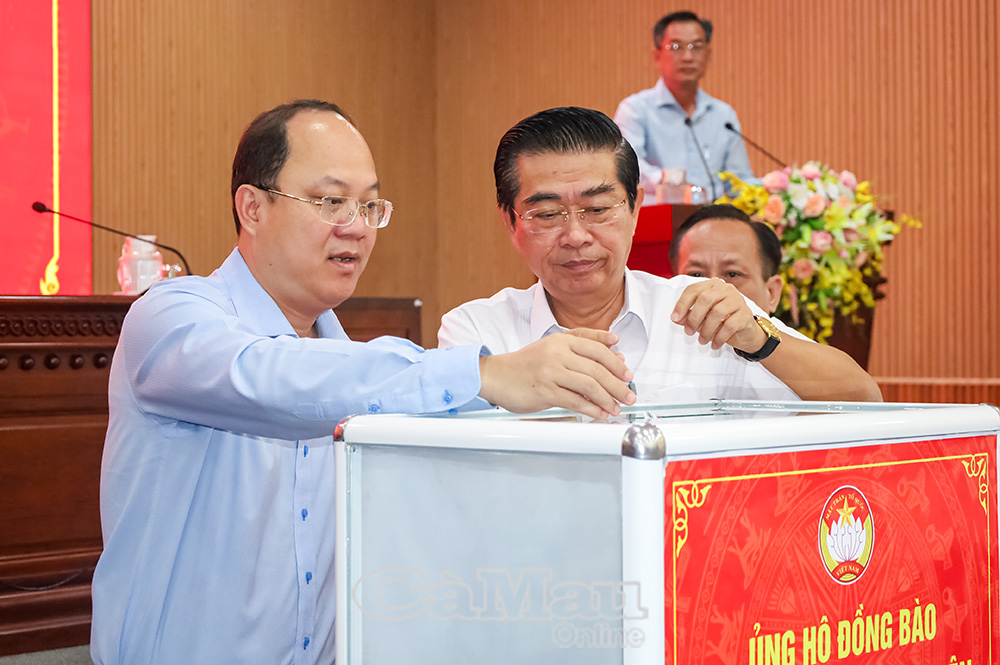 Đồng chí Võ Văn Dũng, Uỷ viên Ban Chấp hành Trung ương Đảng, Phó Trưởng ban Nội chính Trung ương và đồng chí Nguyễn Hồ Hải, Bí thư Tỉnh uỷ Cà Mau, trao gửi tình cảm, chung tay sẻ chia khó khăn với đồng bào miền Trung và Tây Nguyên sau thiên tai, bão lũ.