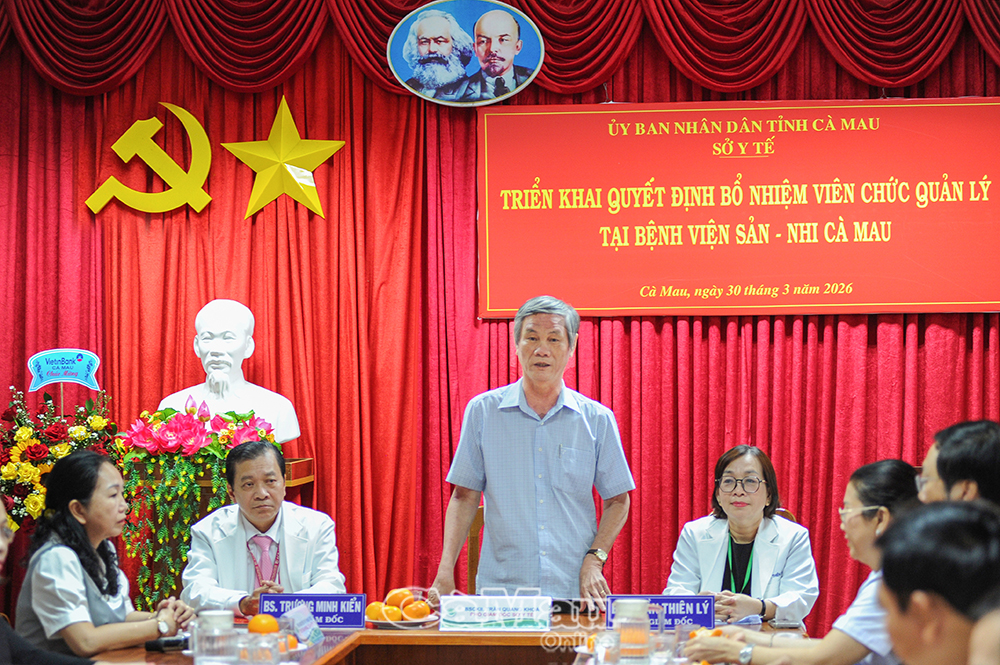 Tại buổi lễ, Sở Y tế công bố quyết định bổ nhiệm Bác sĩ CKII Trương Minh Kiển, Phó Giám đốc Bệnh viện Sản - Nhi Cà Mau, giữ chức vụ Giám đốc bệnh viện. Quyết định có hiệu lực từ ngày 30/3/2026.