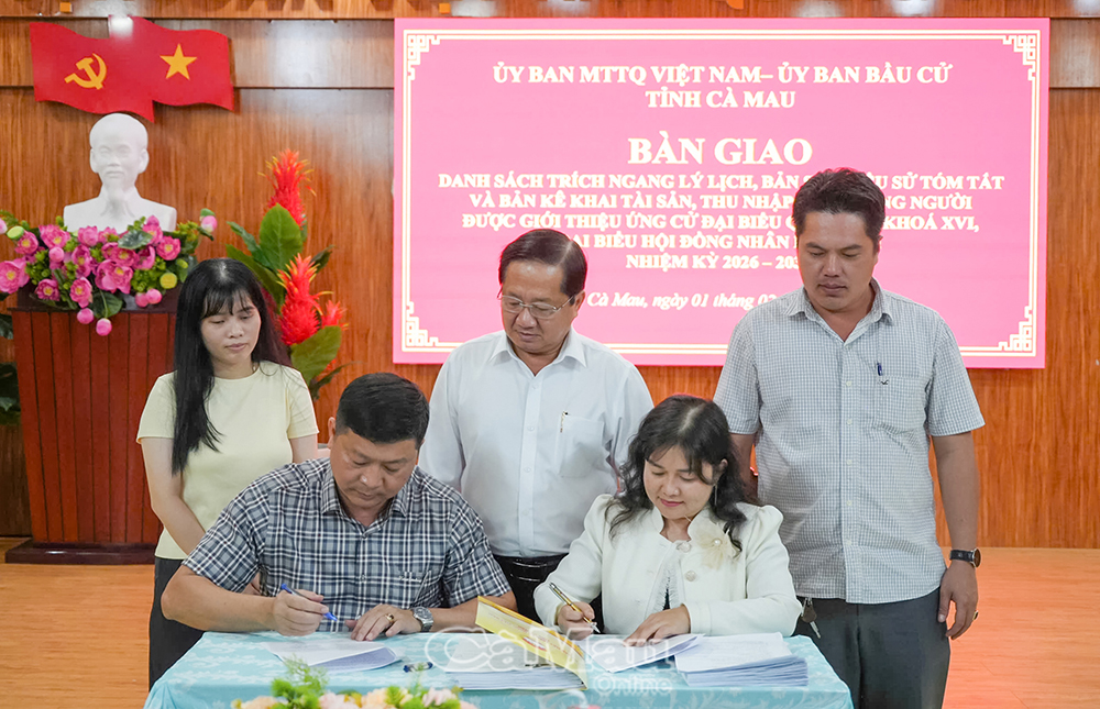 Đồng chí Lê Thanh Triều, Uỷ viên Ban Thường vụ Tỉnh uỷ, Phó Chủ tịch Thường trực Uỷ ban MTTQ Việt Nam tỉnh Cà Mau (giữa), chứng kiến Phó Giám đốc Sở Nội vụ Lê Minh Hiền và Phó Chủ tịch Uỷ ban MTTQ Việt Nam tỉnh Cà Mau Võ Thị Ngọc Hân ký biên bản bàn giao hồ sơ người ứng cử đại biểu Quốc hội khoá XVI và đại biểu HĐND tỉnh, nhiệm kỳ 2026-2031.