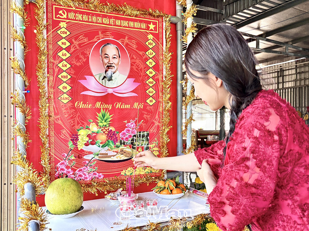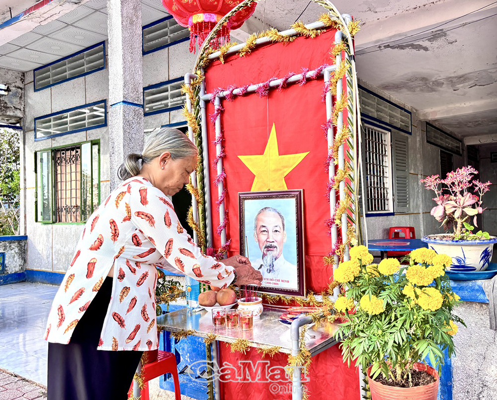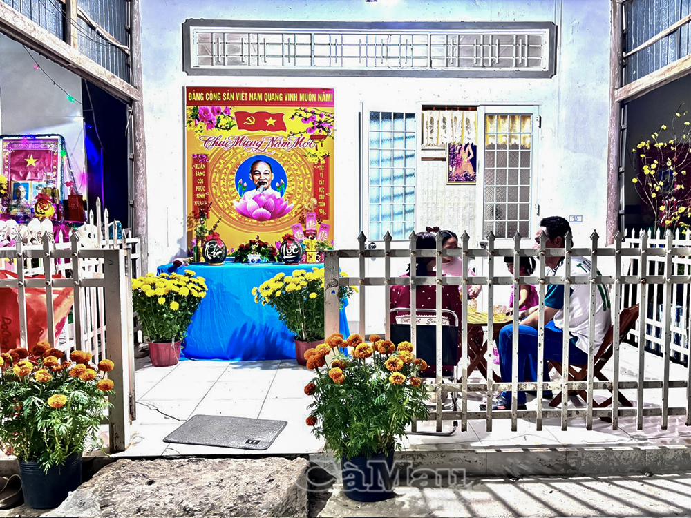 Ở Ấp 19/5, xã Khánh Bình - địa phương được đặt tên theo ngày sinh nhật Bác Hồ, hình ảnh bàn thờ Tổ quốc ngày xuân càng trở nên quen thuộc. Dọc tuyến đường trước nhà, nhiều gia đình treo cờ dây đỏ, nhà nào cũng trang hoàng bàn thờ trước hiên. Cả xóm như khoác lên gam màu rực rỡ, tạo nên không khí xuân vừa trang nghiêm vừa gần gũi.