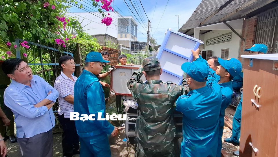 Lực lượng chức năng hỗ trợ người dân di dời tài sản đến nơi an toàn. Ảnh: M.Đ
