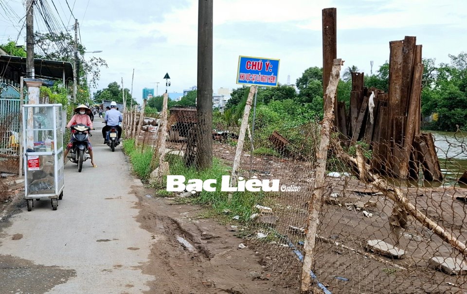 UBND Phường 5 (TP. Bạc Liêu) cắm biển báo khu vực có nguy cơ xảy ra sạt lở.