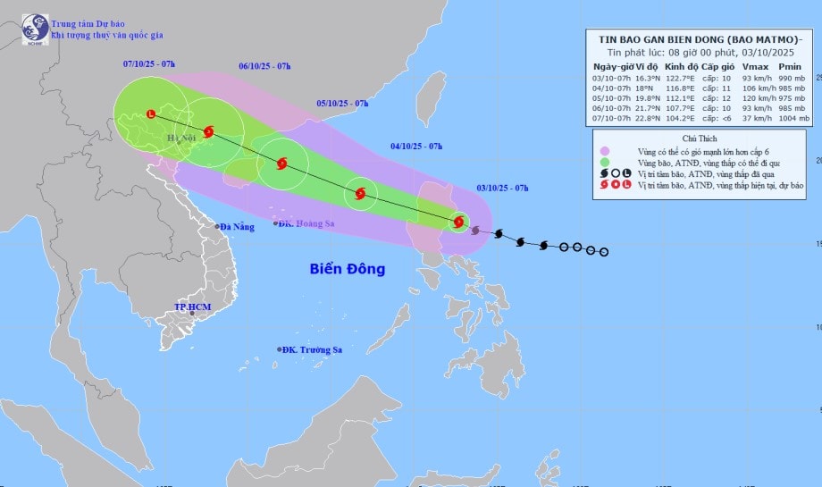Trung tâm Dự báo khí tượng thủy văn quốc gia cho biết, vào hồi 7 giờ ngày 3/10, tâm bão số 11 MATMO ở trên vùng biển phía Đông đảo Lu-Dông (Phi-líp-pin). Sức gió mạnh nhất vùng gần tâm bão mạnh cấp 9-10 (75-102km/giờ), giật cấp 13.