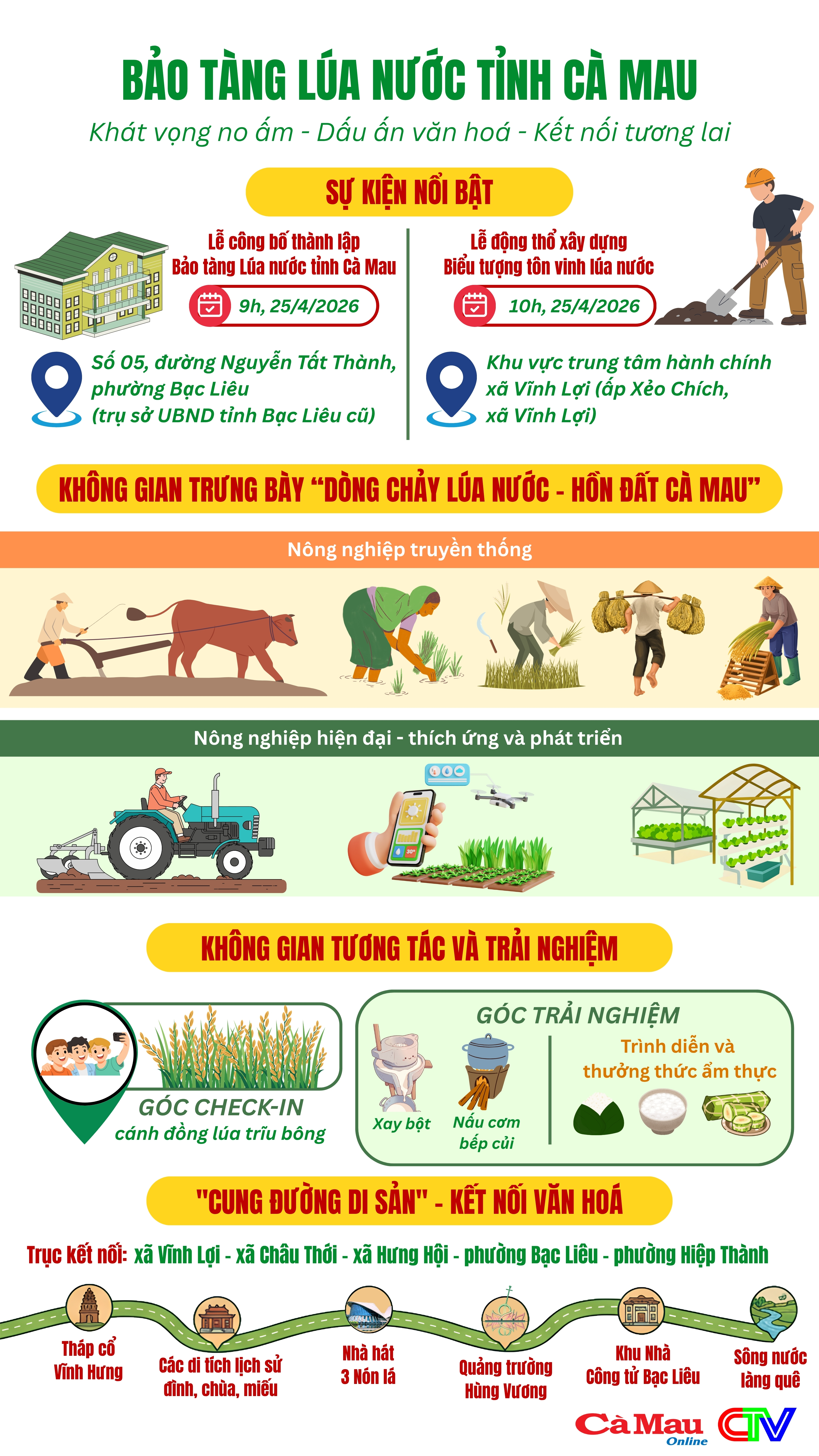 Theo kế hoạch, chương trình truyền hình trực tiếp “Vầng trăng cổ nhạc” Cà Mau - 2026 sẽ diễn ra vào tối 26/4, trong khuôn khổ chuỗi sự kiện Tuần lễ Khoa học, Công nghệ - Văn hoá, Du lịch và Cuộc thi Gạo ngon đồng bằng sông Cửu Long lần thứ I, năm 2026 (từ 24/4-1/5), tại Quảng trường Hùng Vương (phường Bạc Liêu).
