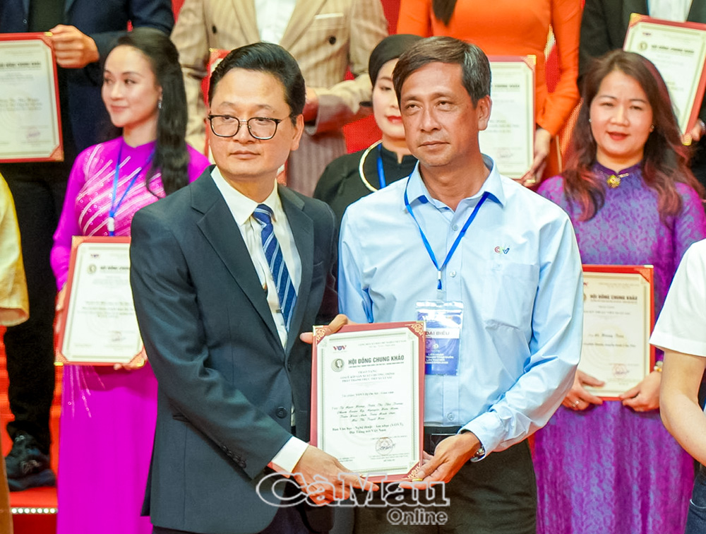 Phó Trưởng phòng Biên tập Phát thanh - Truyền hình Cà Mau Lâm Kỳ Bảo Quốc thay mặt đơn vị nhận giải thưởng Kỹ thuật viên xuất sắc.