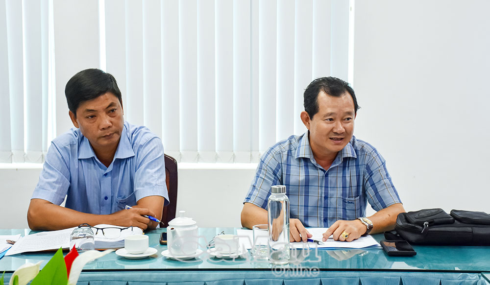Các đồng chí Phó Tổng Biên tập: Ngô Minh Toàn (bên phải), Trương Văn Tuấn cũng trao đổi, thông tin với xã Vĩnh Lợi về hoạt động hỗ trợ XDNTM và phối hợp thông tin, tuyên truyền.