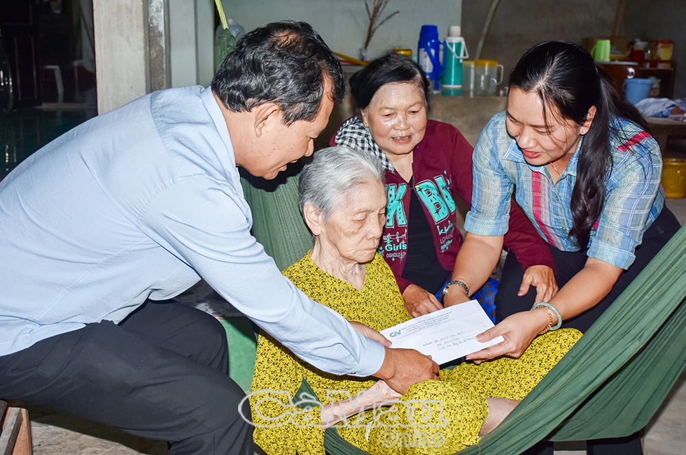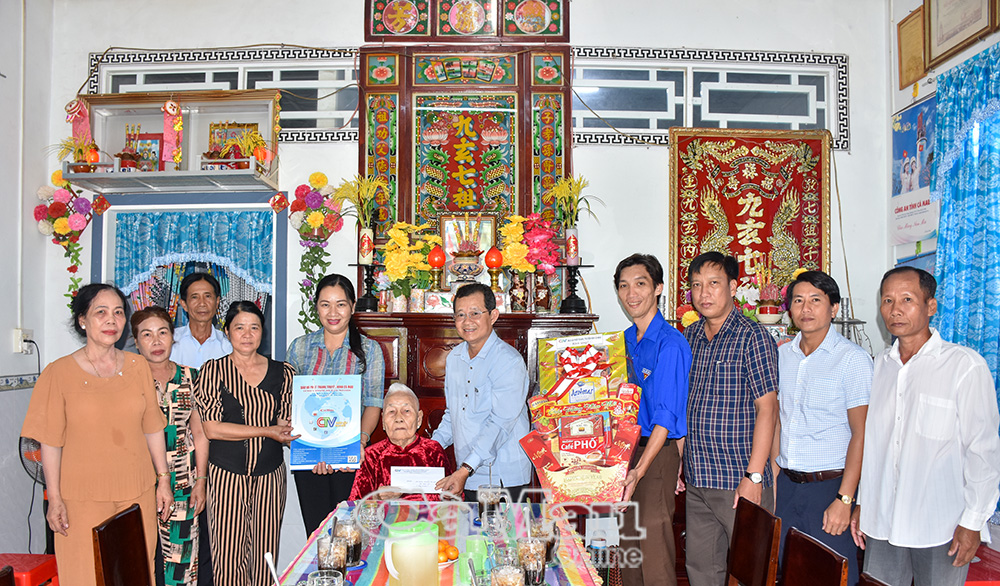 Nhà báo Ngô Minh Toàn, Phó Giám đốc Thường trực Báo và phát thanh, truyền hình Cà Mau ân cần thăm hỏi sức khoẻ Mẹ VNAH Nguyễn Thị Huôi, tặng quà và cùng các thành viên đoàn chụp ảnh lưu niệm với gia đình.