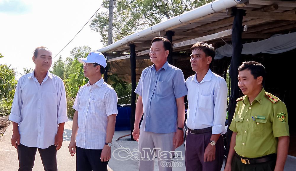 Đồng chí Hồ Thanh Thuỷ, Phó Bí thư Tỉnh uỷ, Chủ tịch Uỷ ban MTTQ Việt Nam tỉnh Cà Mau (thứ hai từ trái sang), khảo sát thực tế tại hộ dân nhận đất rừng phòng hộ giao khoán thực hiện mô hình tôm - rừng.