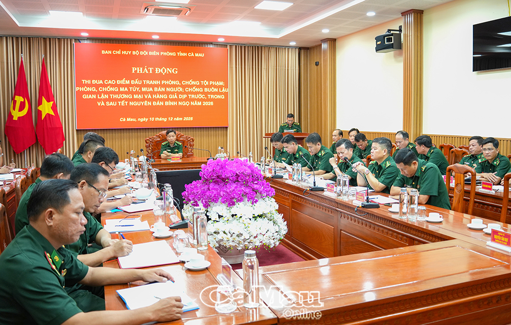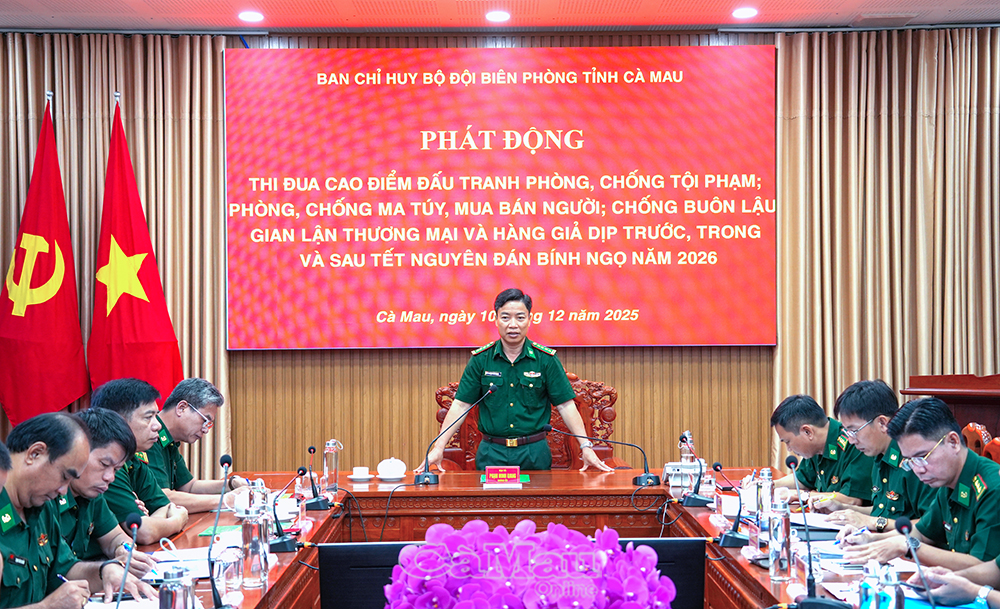 Báo Cà Mau Sáng 10/12, Ban Chỉ huy Bộ đội Biên phòng tỉnh Cà Mau tổ chức phát động đợt thi đua cao điểm đấu tranh phòng, chống tội phạm; phòng, chống ma túy; phòng, chống mua bán người; chống buôn lậu, gian lận thương mại và hàng giả trên khu vực biên giới biển của tỉnh, dịp trước, trong và sau tết Nguyên đán Bính Ngọ 2026.