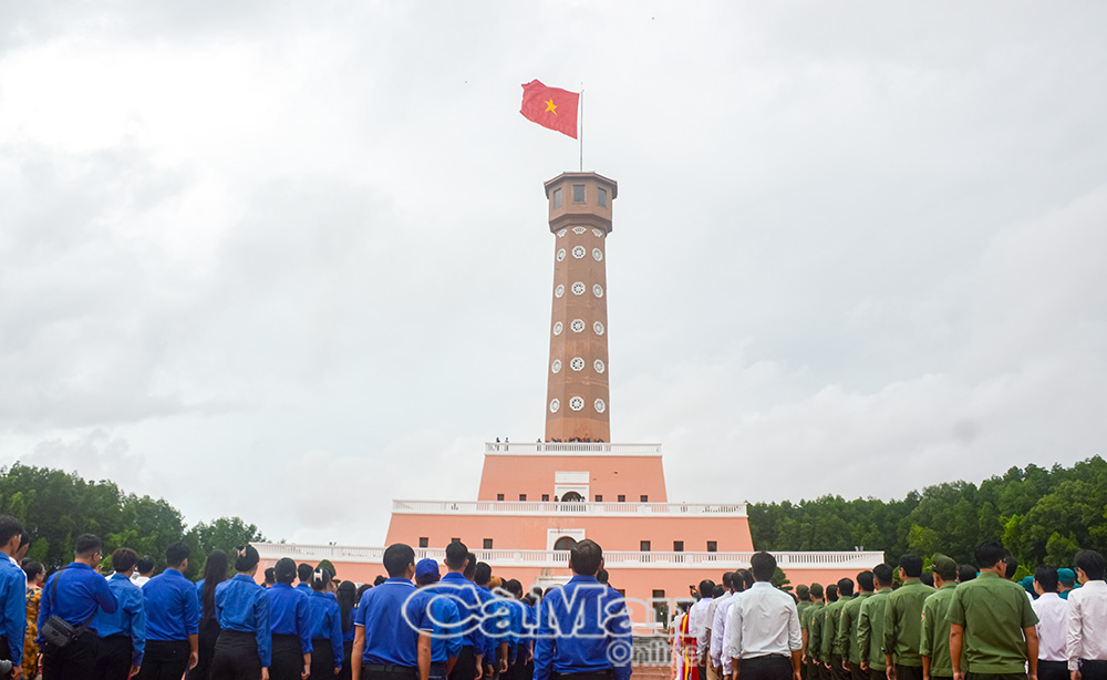 Lãnh đạo tỉnh, đoàn đại biểu cùng hơn 400 cán bộ, chiến sĩ, đoàn viên và học sinh xã Đất Mũi trang nghiêm thực hiện nghi thức chào cờ.