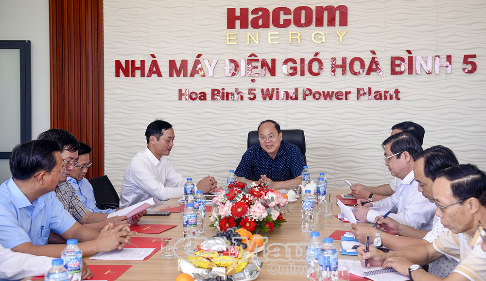Bí thư Tỉnh uỷ Nguyễn Hồ Hải (giữa) nghe báo cáo về hoạt động Nhà máy điện gió Hòa Bình 5 (giai đoạn 1).