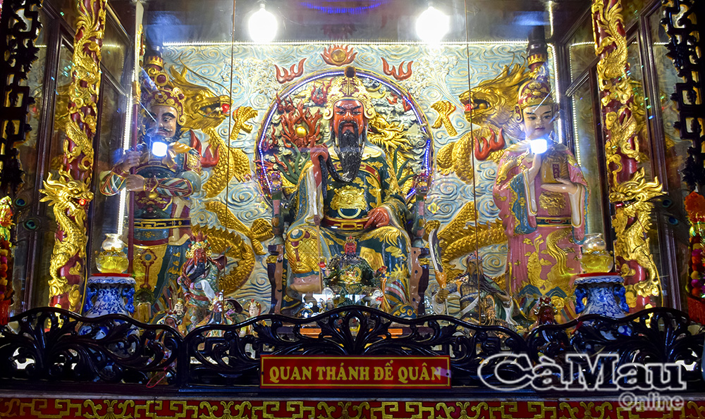 Tượng thờ Quan Thánh Đế Quân cùng 2 hộ pháp Quan Bình và Châu Xương, biểu trưng cho tinh thần trung nghĩa và chính trực.