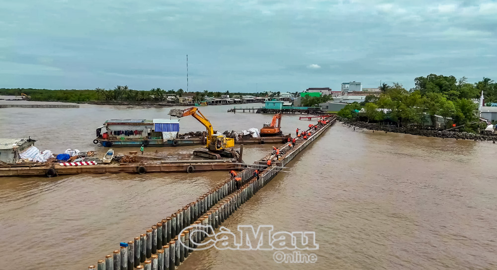 Báo Cà Mau Công trình thi công kè bảo vệ bờ biển tại khu vực cửa biển Khánh Hội thuộc xã Khánh Lâm, 1 trong 3 gói thầu của Dự án Xây dựng kè chắn sóng, phòng chống sạt lở, gây bồi tạo bãi và bảo vệ đê biển, với chiều dài 7 km. Việc thi công trên biển luôn gặp nhiều khó khăn, nhưng với quyết tâm đảm bảo tiến độ, đơn vị thi công đã tập trung phương tiện, máy móc và nhân công thực hiện.