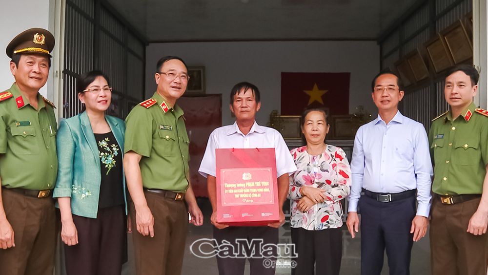 Thượng tướng Phạm Thế Tùng, Thứ trưởng Bộ Công an, cùng lãnh đạo tỉnh Cà Mau trao quà của Đại tướng Lương Tam Quang, Uỷ viên Bộ Chính trị, Bộ trưởng Bộ Công an tặng gia đình đình bà Nguyễn Hồng Hận.